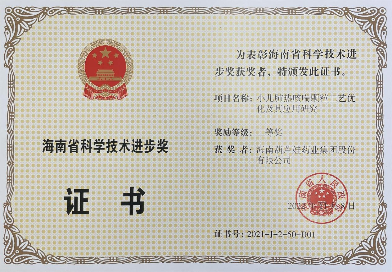 为此,小儿肺热咳喘颗粒的制备方法获得了第二十一届中国专利优秀奖(2019年),专利申请号:ZL201010134951,此次作为专利技术的应用,获得了2021年度海南省科学技术进步奖二等奖。在此之前,彩虹多多牌小儿肺热咳喘颗粒还多次被授予“临床价值中成药品牌”、“中国连锁药店最具合作价值单品”,荣登“中国医药品牌榜”。