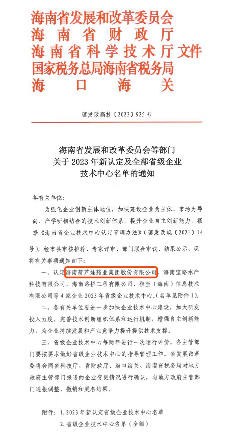 近日,海南省发改委等多部门联合公布了《关于2023年新认定及全部省级企业技术中心名单的通知》,其中,海南彩虹多多药业集团股份有限公司成功通过评审,被认定为省级企业技术中心,是本次获批的4家企业之一。